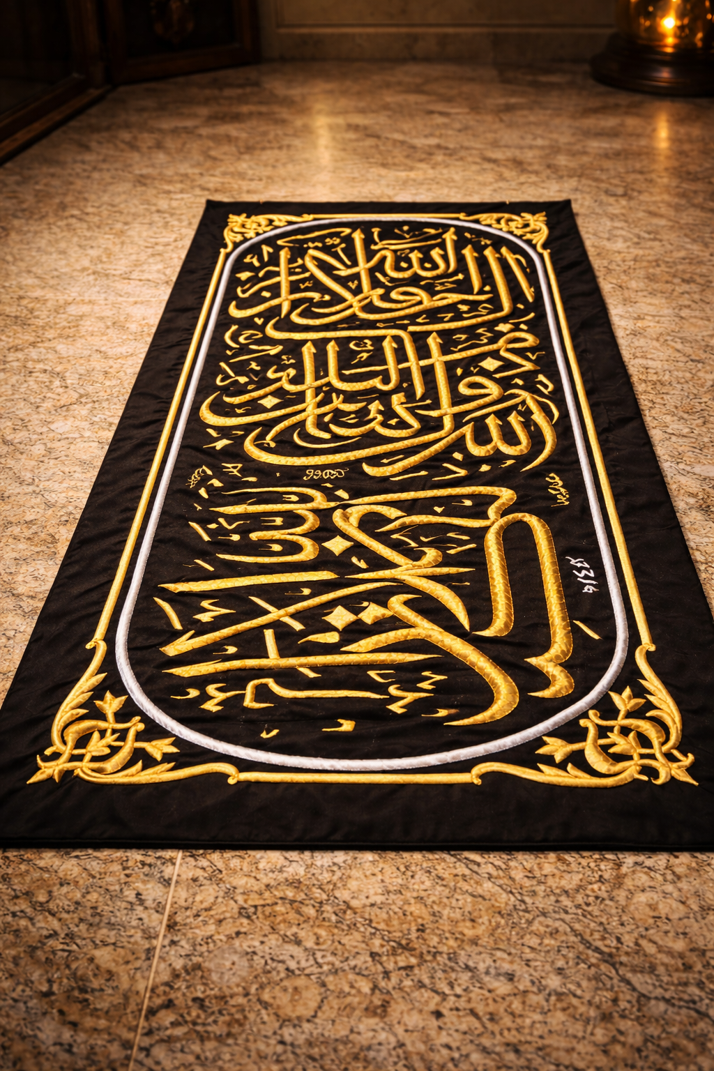 Crafted from a premium silk-polyester blend and embroidered using gold-polished copper wire, this Kiswah belt piece reflects the spiritual and artistic significance of the Kaaba covering.
